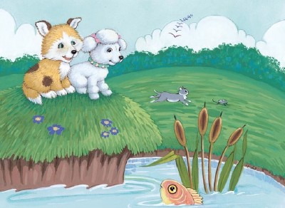 “No,” said Fifi. “We don’t have a pond. Our fish live in a bowl on the dresser. We would never think of eating those little things.” A farm cat ran by. She was chasing a mouse. Rex gave her a friendly bark.