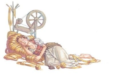 The little man clapped his hands with delight. He skipped over to the spinning wheel and sat down. With a great whir, the man set the spinning wheel in motion. As the little man worked, the miller’s daughter lay down on a pile of soft golden thread. Soon, she was asleep.