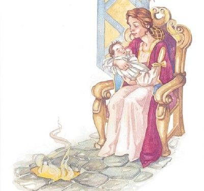 One day, the queen sat with her daughter in the royal nursery. The queen cradled the baby in her arms and sang to her. All of a sudden, the strange little man appeared in front of the queen.